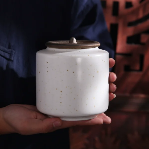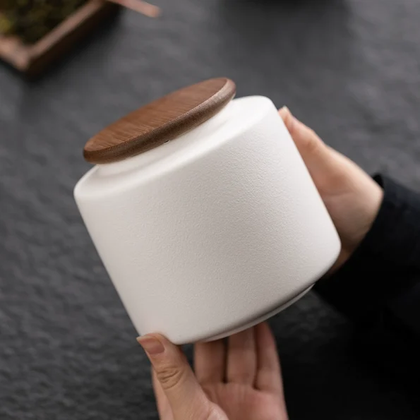 Ceramic Tea Canister with Wooden Lid, Airtight Porcelain Storage Jar for Tea, Coffee, Spices, and Dry Goods